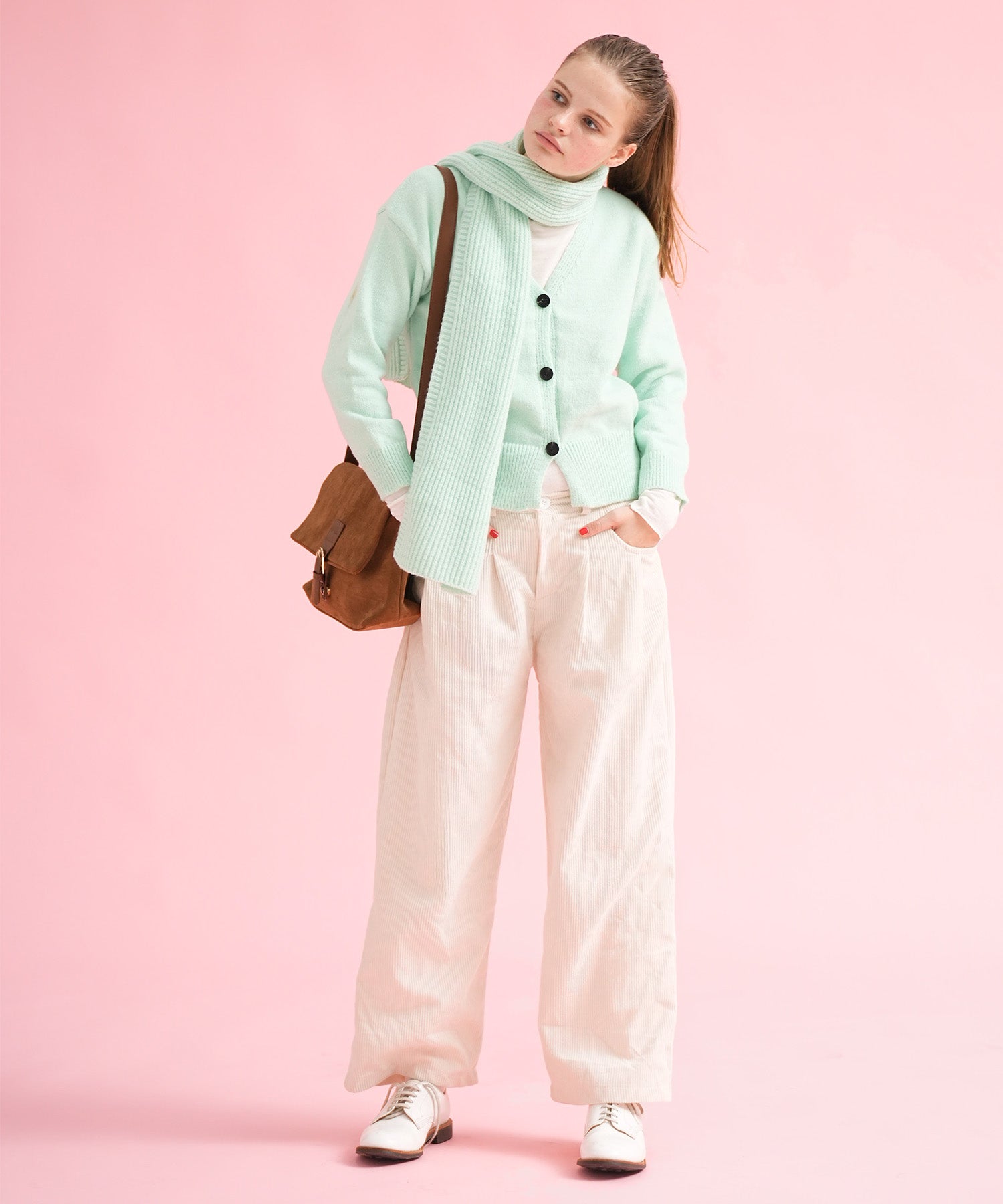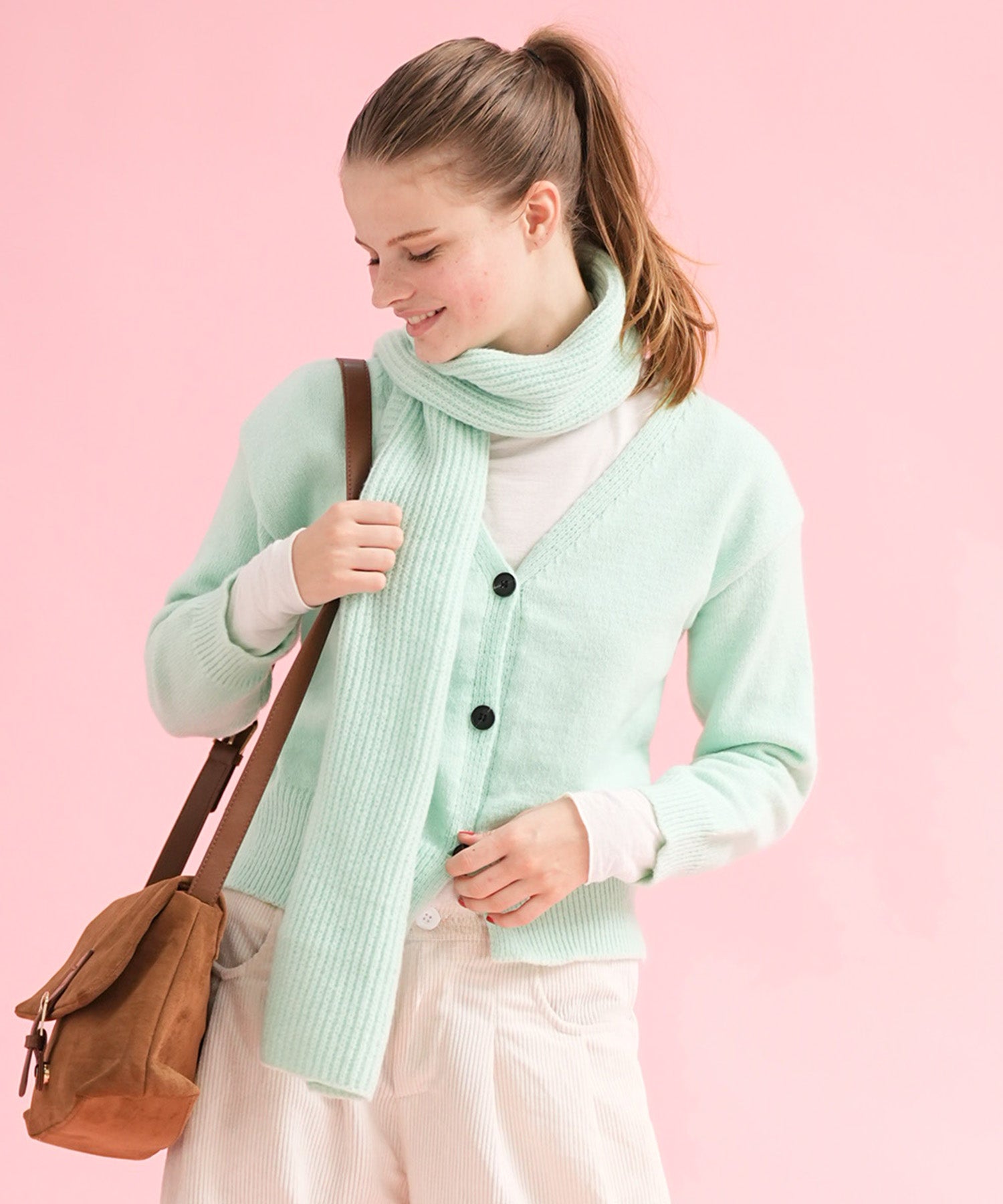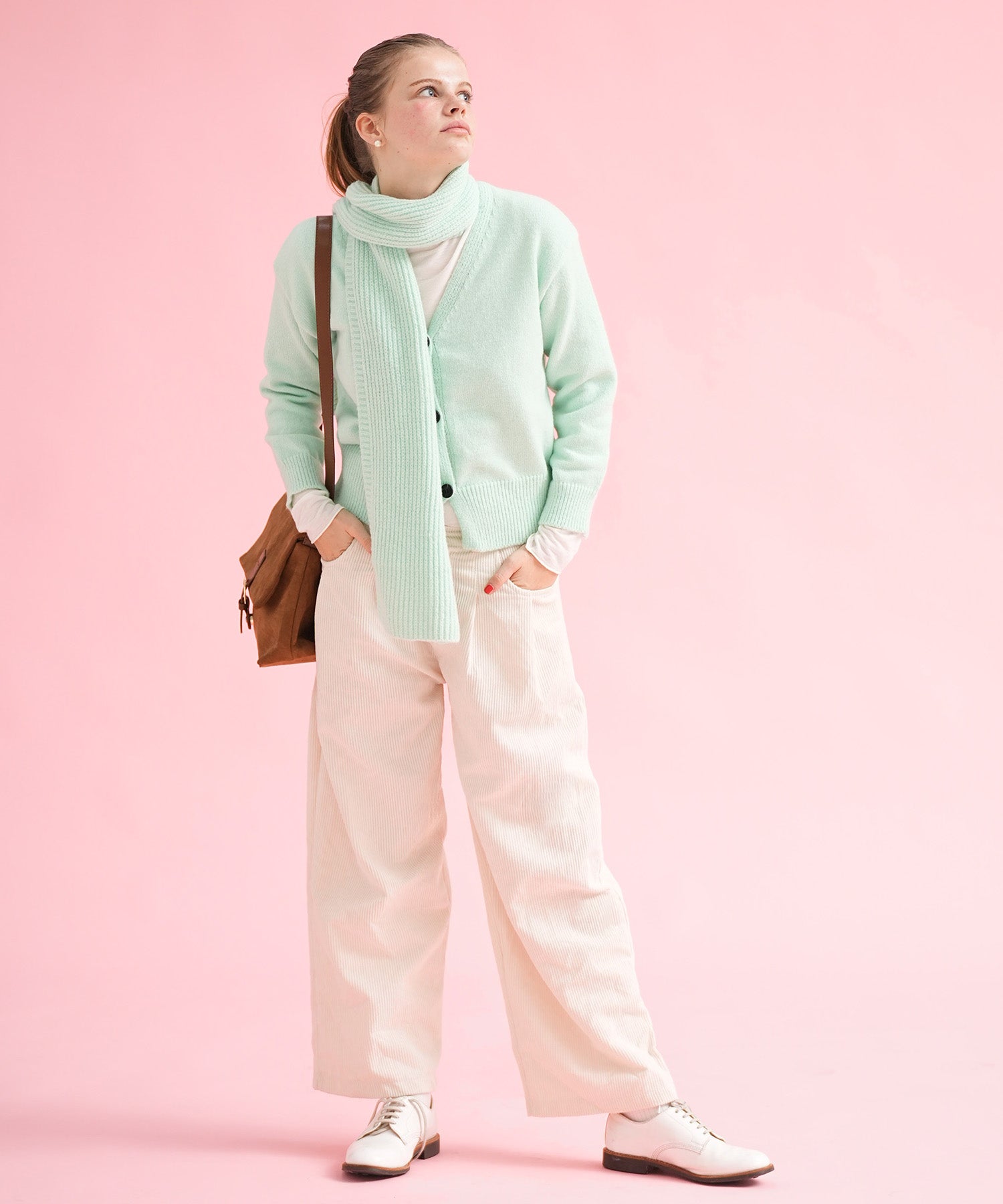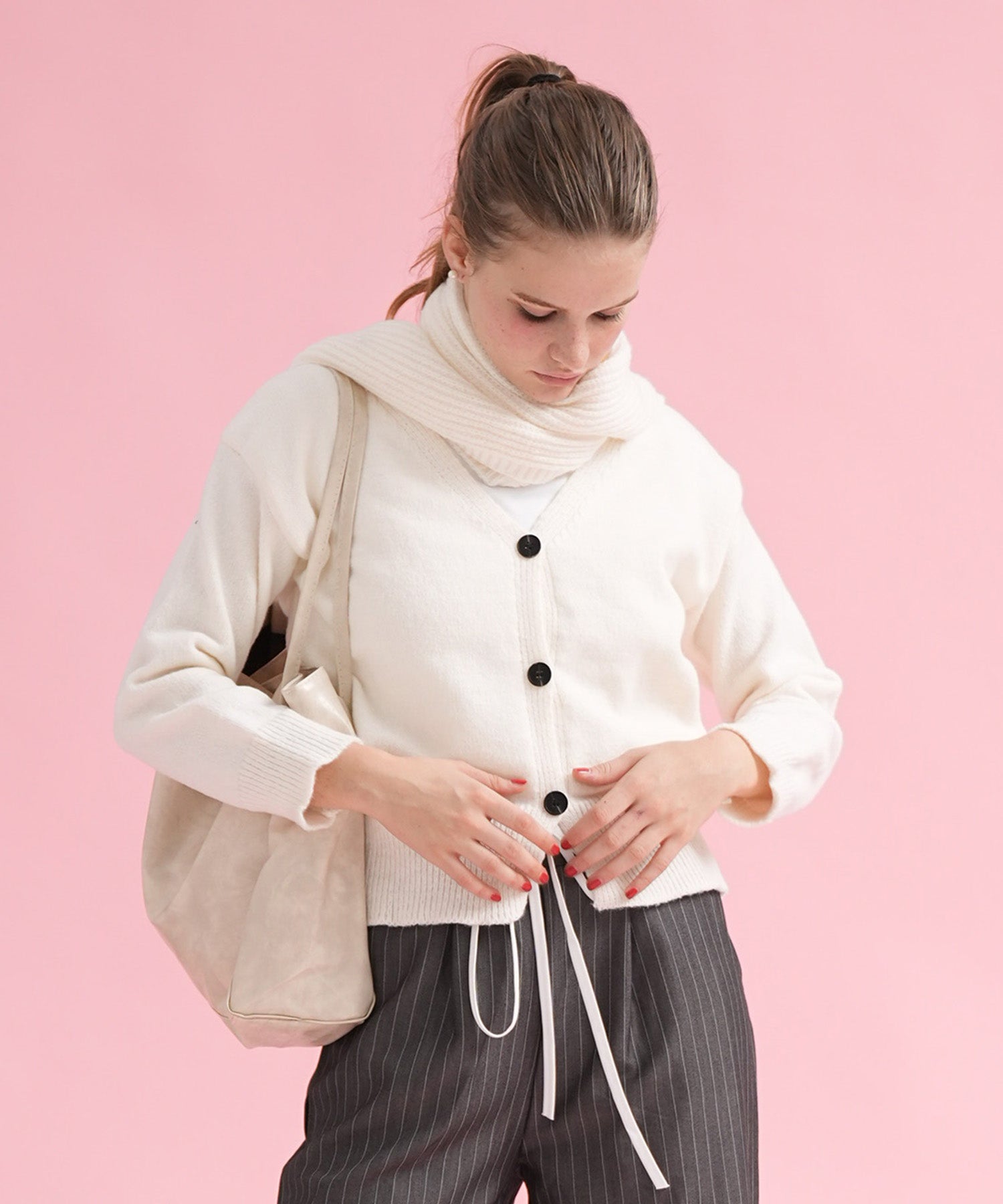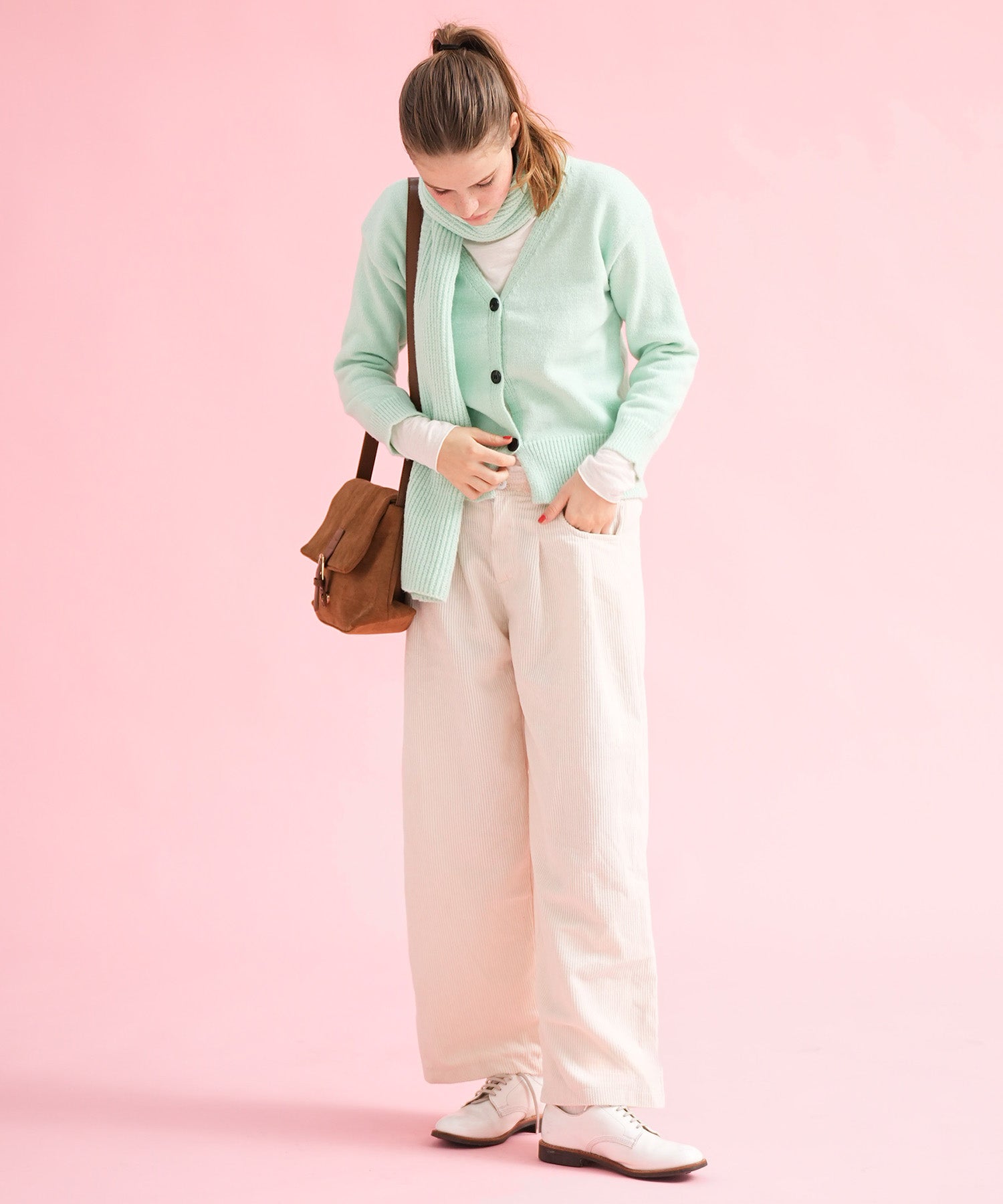 カーディガンはVネックで抜け感のある大人な印象に着こなせます。