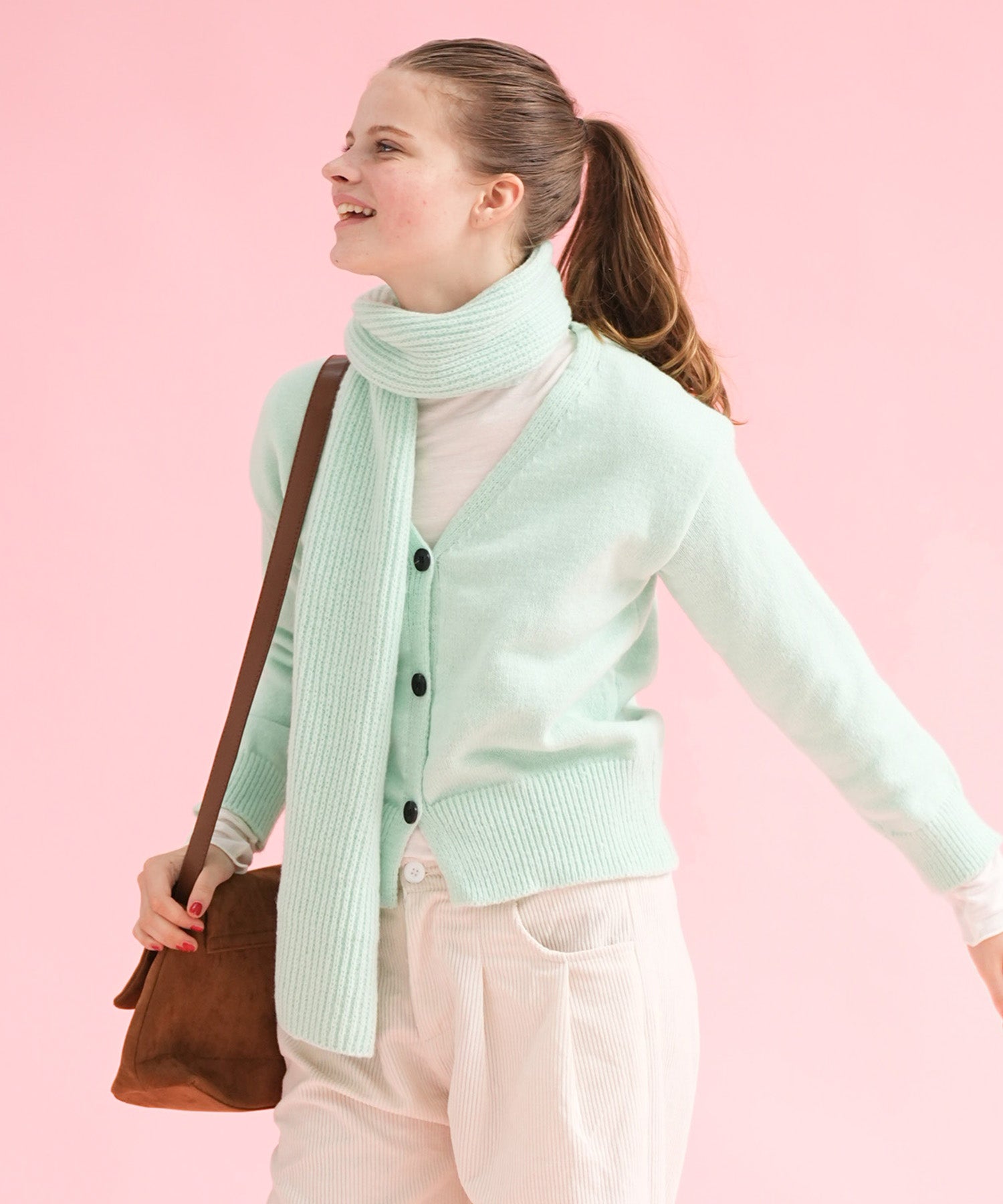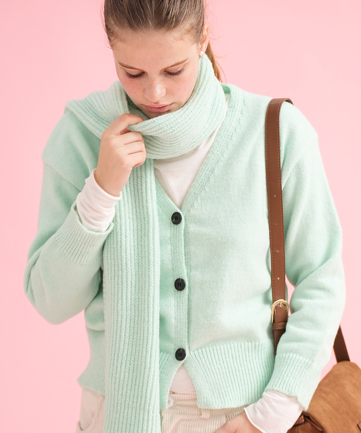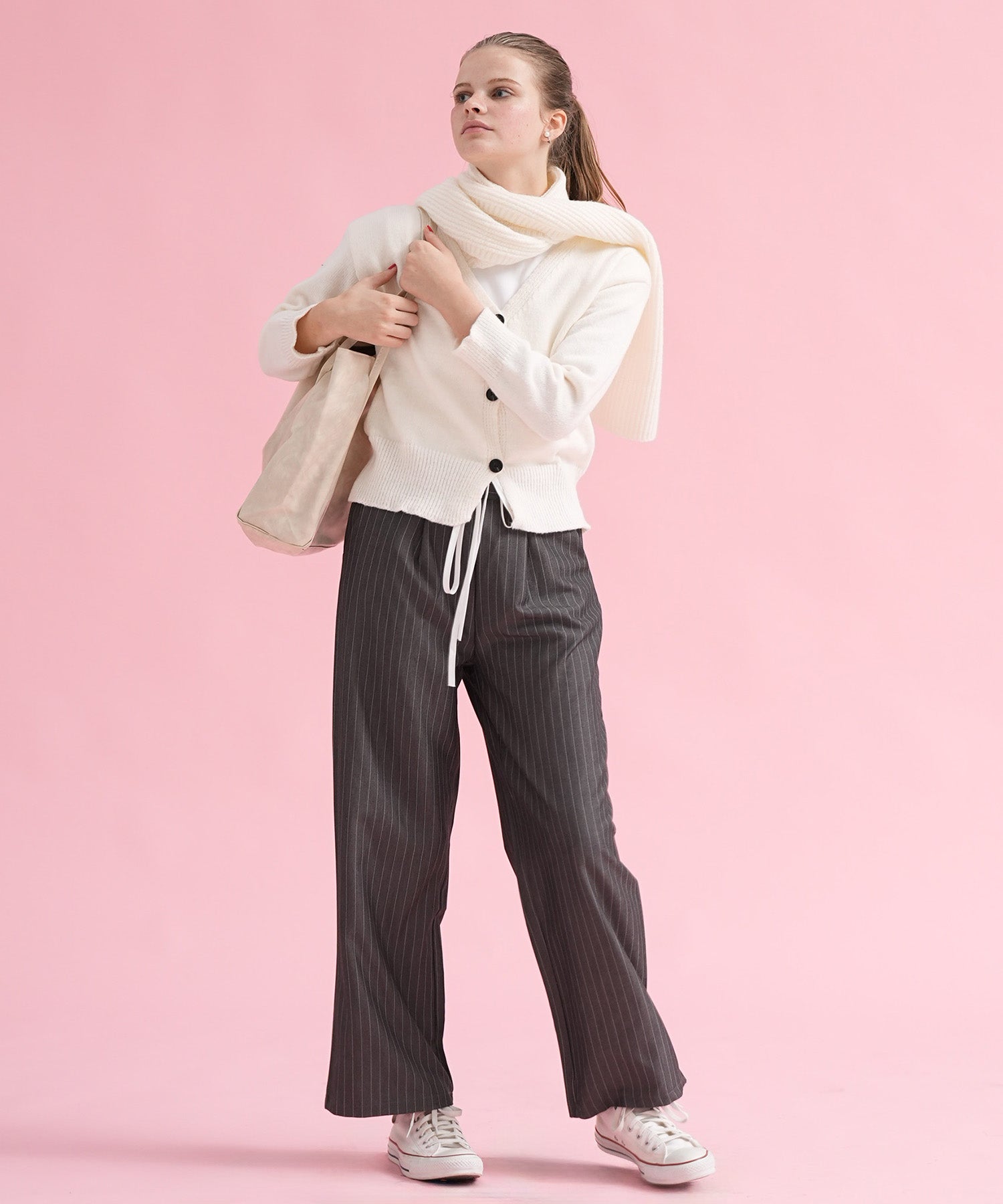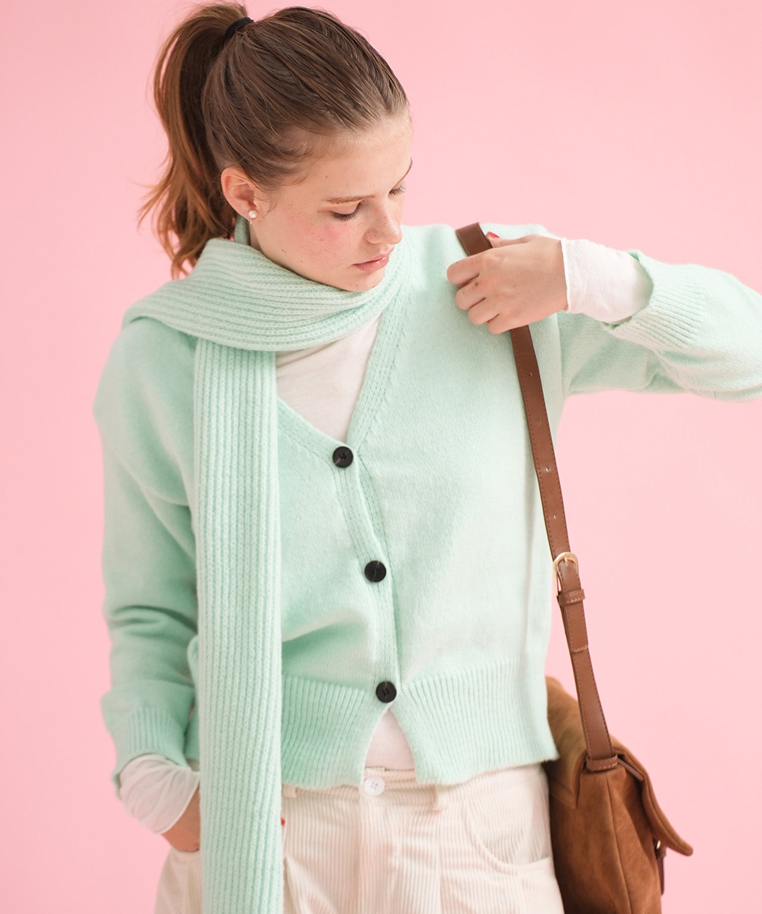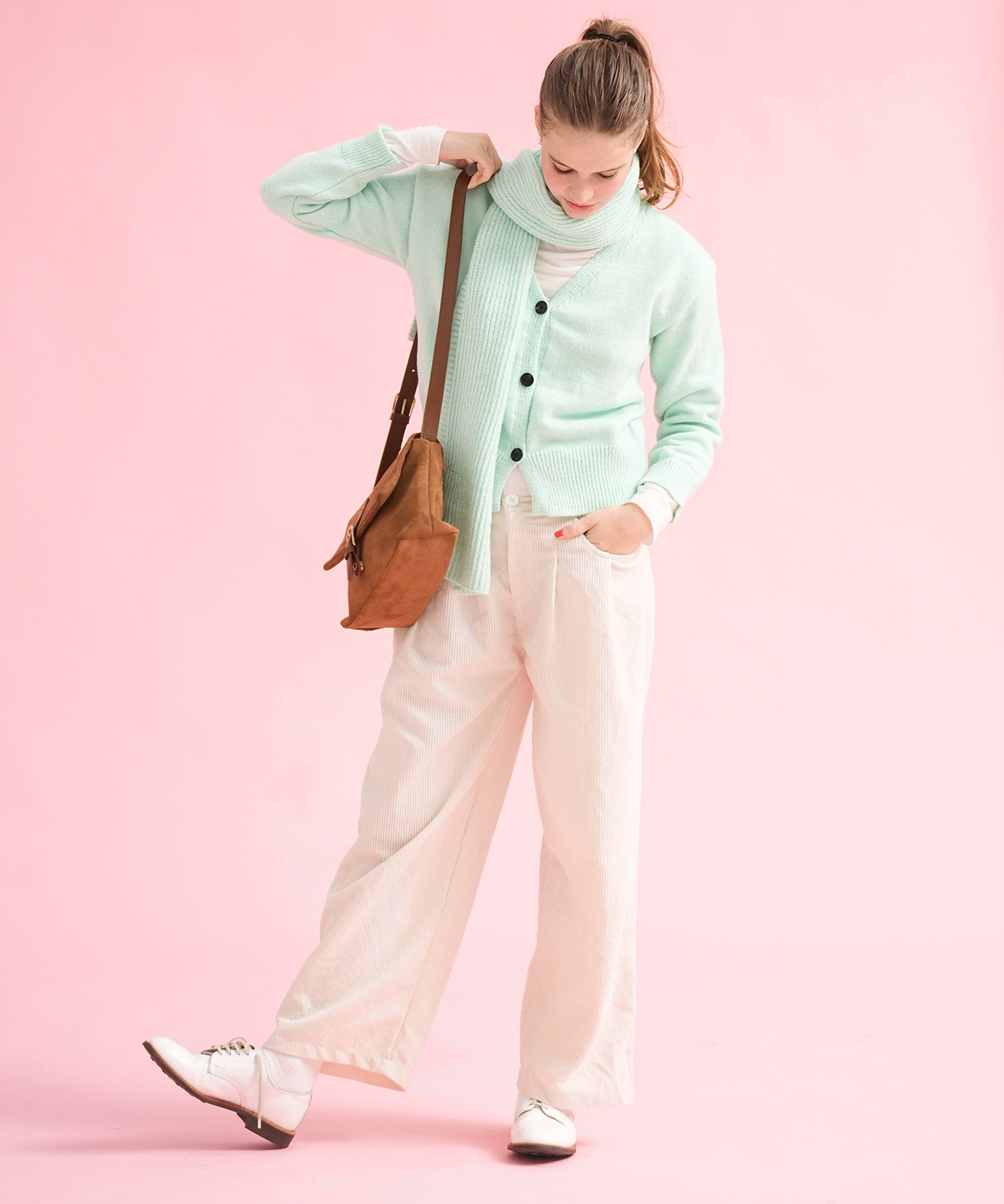 カーディガンはVネックで抜け感のある大人な印象に着こなせます。